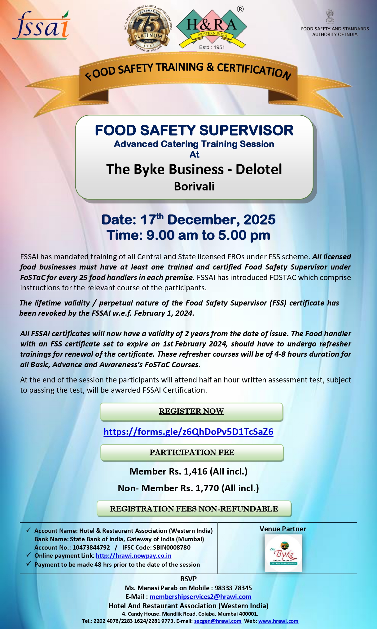 We are pleased to inform you that the FSSAI - Food Safety Supervisor Training in Advance Catering in collaboration with HRAWI, an initiative to promote food safety and hygiene in Hospitality Industry is schedule to be held at The Byke Business - Delotel (Borivali), Mumbai on17th December, 2025 i.e. Wednesday from 09:00 a.m. to 05:00 p.m.