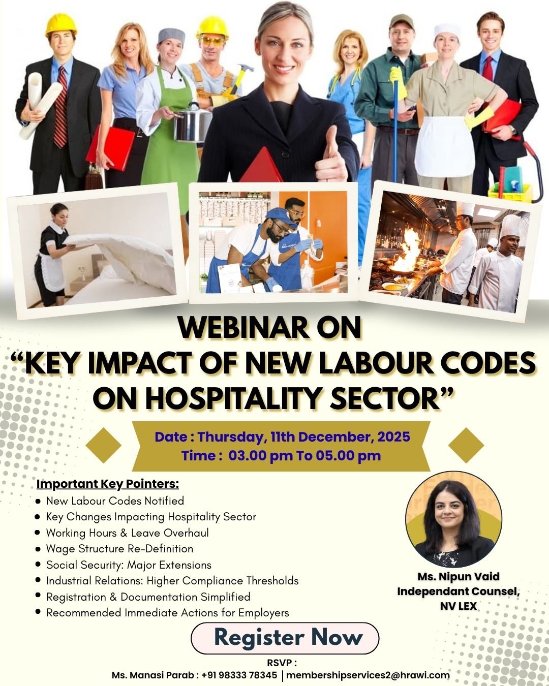 We are pleased to announce a webinar on “Key Impact of the New Labour Codes on the Hospitality Sector” scheduled to be held on Thursday, 11th December 2025, from 3:00 p.m. to5:00 p.m. on Virtual Platform.